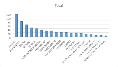 • Podeu veure el número total d’alumnes de cada extraescolar en aquest gràfic. Com veieu l’activitat d’anglès és on més alumnes hi participen (117 alumnes), seguida de gimnàstica i teatre.