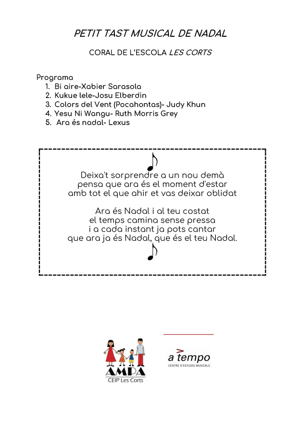 Des de la coral de l’Escola Les Corts (extraescolar de Coral) us volem convidar al Petit Tast musical de Nadal que farem: