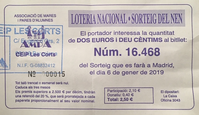 Aquest any, amb les participacions de la Loteria de “El Niño“, ens retornen els diners: 2,10 Eur. per cada participació.