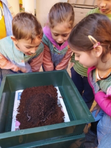 Amb el suport de la Laura d’Arrels i brots, els alumnes del taller d’hort de 1er i 2n poden donar de menjar restes orgàniques de la cuina de l’escola als cucs i els hauran de cuidar donant-los la temperatura i humitat adequada.