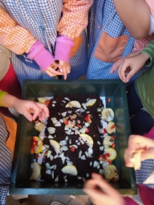 - Els alumnes posant restes de menjar al vermicompostador