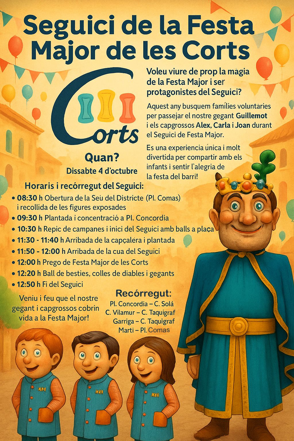 Aquest any busquem famílies voluntàries per passejar el nostre gegant Guillemot i els capgrossos Àlex, Carla i Joan durant el Seguici de la Festa Major.